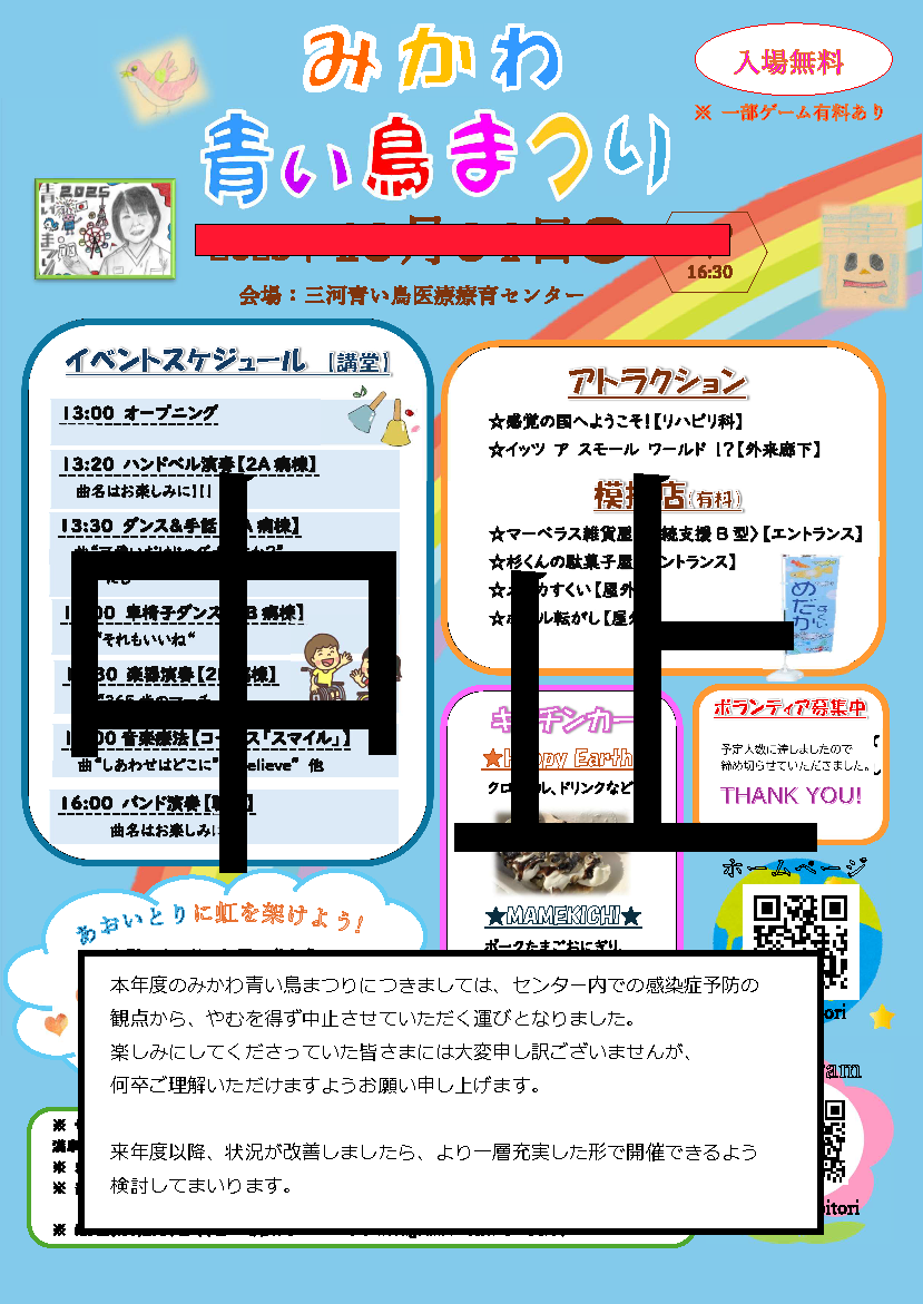 10月4日に開催を予定しておりました「みかわ青い鳥まつり」は、センター内での感染症予防の観点から、やむを得ず中止させていただくこととなりました。