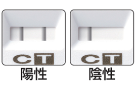 写真は新型コロナウイルスのテストプレートの判定部です。〔C〕及び[T]の両方にラインが認められた場合を陽性、[C]のみにラインが認められた場合を陰性と判定します。